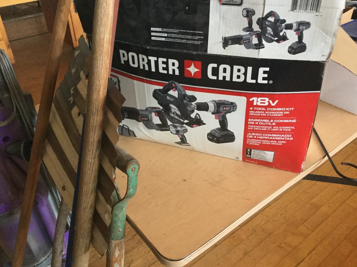 TOOLS/OUTDOOR: New Porter Cable drill driver, reciprocating saw, circular saw, flashlight; Agrifab lawn sweeper; wheelbarrow; jig saw; Craftsman 19.2 drill; axe; craftsman toolbox; Dremel saw; Black and Decker weed eater; large animal crate.